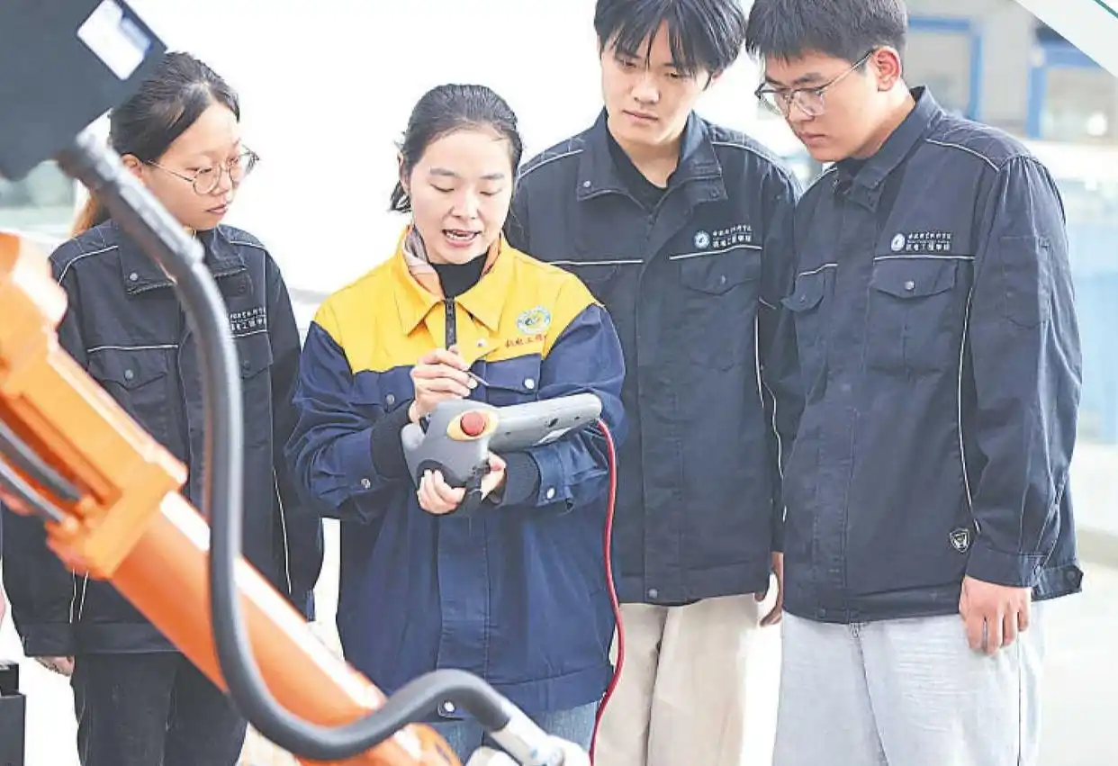合肥职业技术学院焊接机器人实训区,学生在老师指导下学习焊接机器人操作技能。(视觉中国供图)